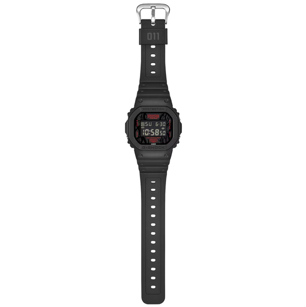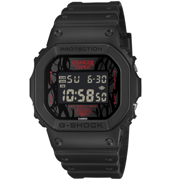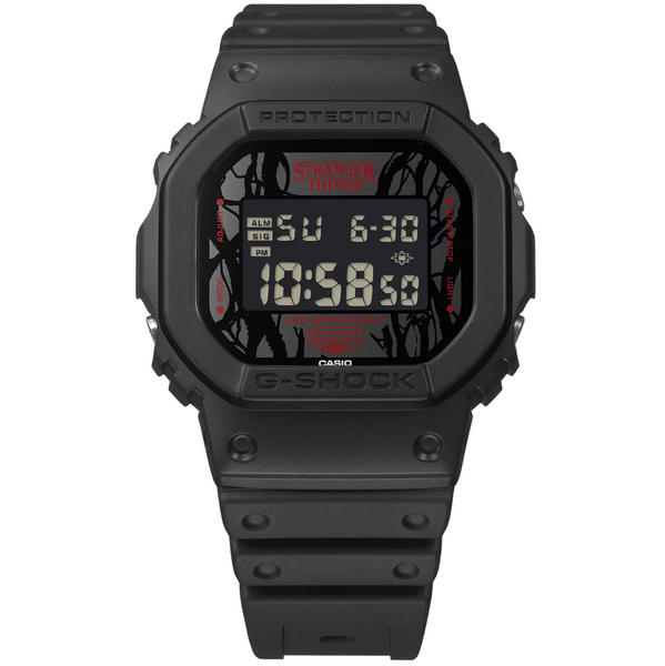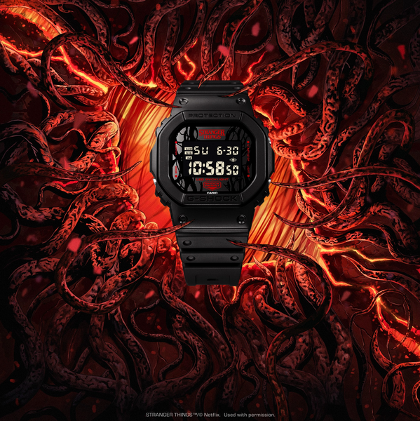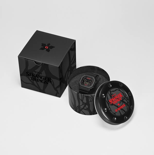 This timepiece is based on the DW5600. Drawing from the dual worlds of the story — the familiar reality and the eerie “Upside Down” — the design weaves key elements of the series into every detail.