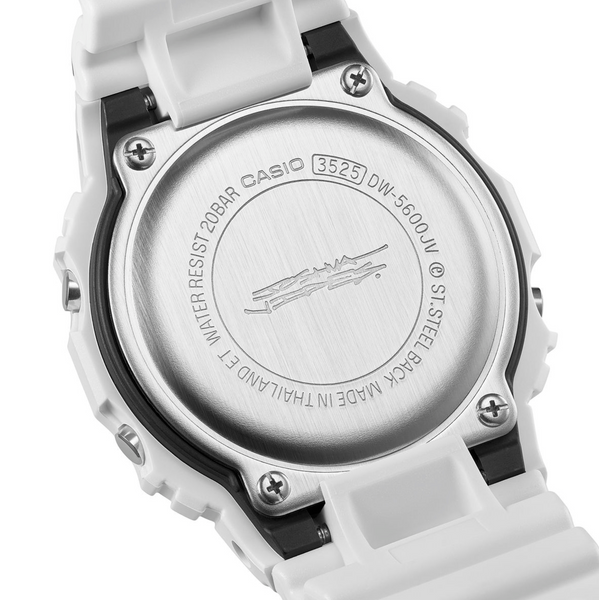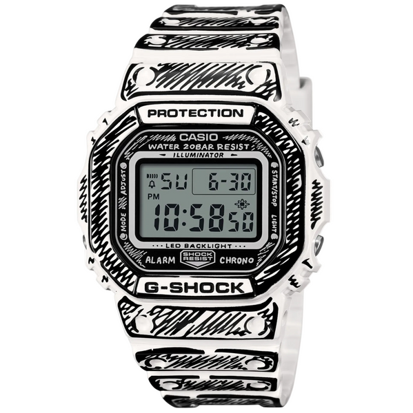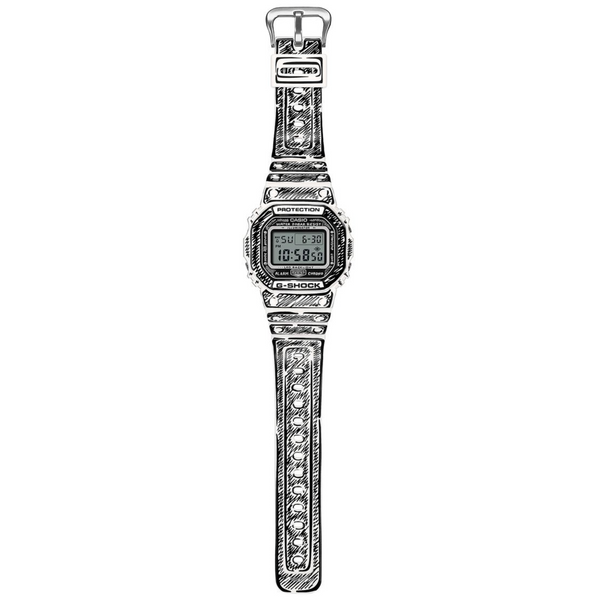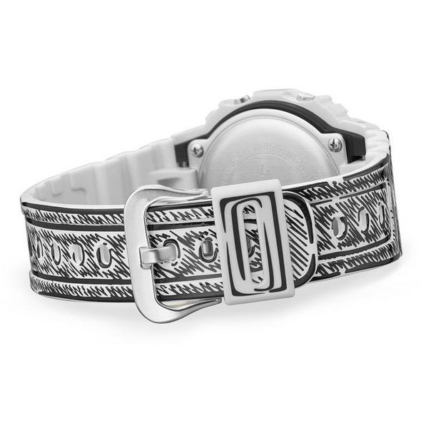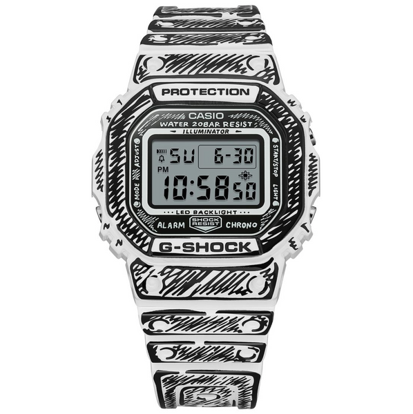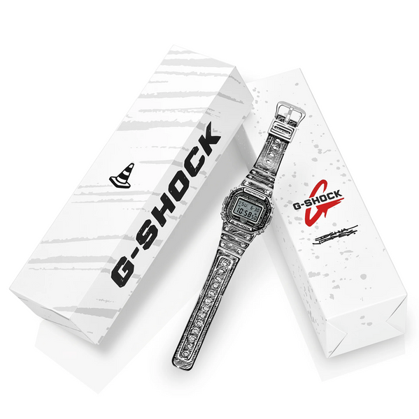 Joshua Vides’ signature monochrome, comic-style graphics are applied across the watch, from the dial to the bezel and band. The white-based DW-5600 is rendered with black graphics and a gloss finish, creating strong contrast and striking presence. It highlights Joshua’s hand-drawn dial artwork, and when the backlight is activated, his trademark “Cone” motif appears. It is the special edition model presented in custom packaging.