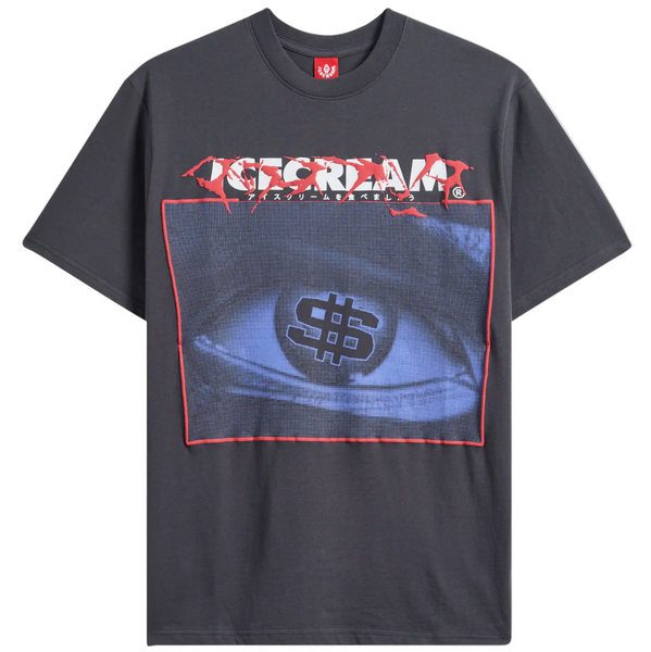 The Eyescream SS Knit features a bold front graphic of an eye with a dollar-sign pupil in a red frame. Distressed Icecream logo and Japanese text complete the front, while the back displays an animated design.