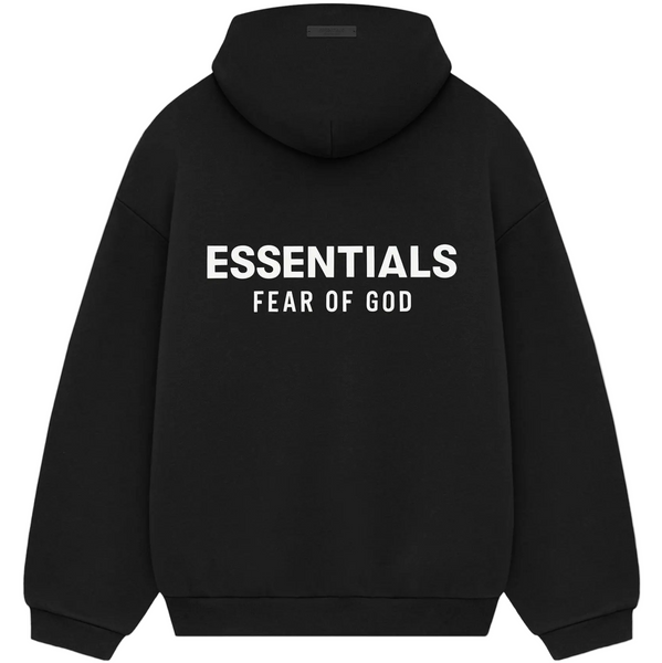 The Fear Of God ESSENTIALS Black Hoodie features an oversized fit, long sleeves, an attached hood, a bold "Essentials " graphic on the Front and Back, and a rubber brand logo on the hood.