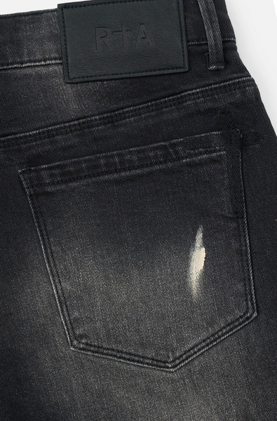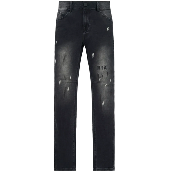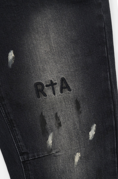 The Bryant Skinny Jean in Inkstone Paint is made from premium denim. Designed with a skinny fit and reinforced stitching on the inner thighs. These jeans feature the RtA logo on the thigh, silver cross rivets on the front pockets, the iconic RtA cross on the back pocket, and signature leather patch on the back waistband finished with a subtle faded wash and paint splatter detailing.