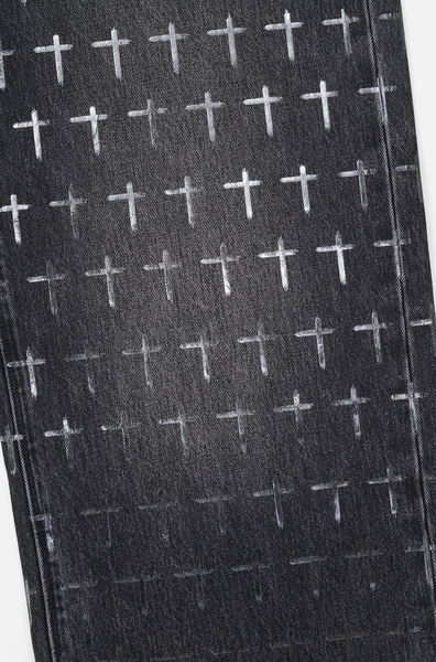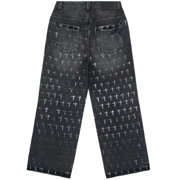 The Franco Wide Leg Jean in Noir Coated Grey is made from premium denim. Designed with a wide leg fit, these jeans feature transparent vinyl RtA crosses throughout, the cross on the back pocket, signature leather patch at the waistband, and a reflective coated finish.